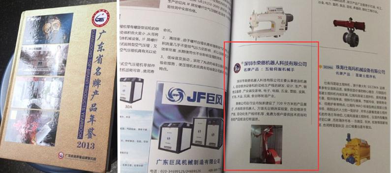 近日由廣東卓越質(zhì)量品牌研究院出版的《2013廣東省名牌產(chǎn)品年鑒》,深圳市榮德機器人科技有限公司赫然在目。