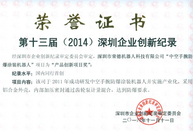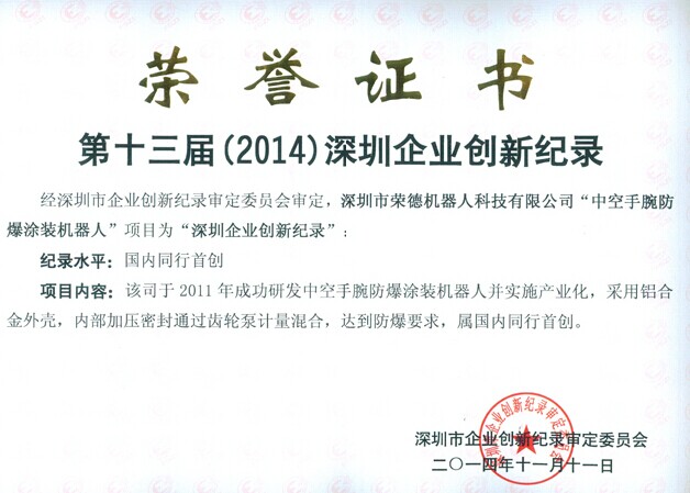 近日,由深圳市企業(yè)創(chuàng)新紀(jì)錄審定委員會(huì)為深圳市榮德機(jī)器人科技有限公司頒發(fā)了“第十三屆(2014)深圳企業(yè)創(chuàng)新紀(jì)錄”的榮譽(yù)證書,榮德公司自主研發(fā)制造的“中空手腕防爆涂裝機(jī)器人”榮獲“產(chǎn)品創(chuàng)新項(xiàng)目獎(jiǎng)”以及“深圳企業(yè)創(chuàng)新紀(jì)錄”兩項(xiàng)大獎(jiǎng),紀(jì)錄水平為“國(guó)內(nèi)同行首創(chuàng)”。