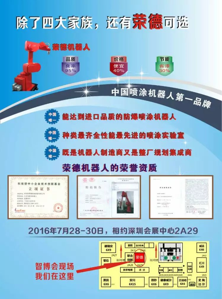 雖然在南海問(wèn)題愈演愈烈的當(dāng)下,支持民族品牌已是大勢(shì)所趨,但榮德機(jī)器人不打感情牌,我們打技術(shù)牌、實(shí)力牌,如果您有興趣參觀過(guò)榮德的展位2A29,也許您會(huì)發(fā)現(xiàn):除了四大家族,榮德噴涂機(jī)器人也是一個(gè)非常不錯(cuò)的選擇!多謝指教!