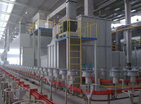 涂裝生產(chǎn)線主要工藝流程是上件→拋丸除銹→清理吹灰→噴鋁→底漆噴漆流平→底漆烘干→中涂噴漆流平→中涂烘干→面漆噴漆流平→面漆噴漆烘干→下件。涂裝線的防腐環(huán)境是室外(不直接淋雨),高架橋腹部波紋板。保護(hù)年限為長效型,50年。主要針對(duì)工廠構(gòu)件外表面涂漆,不考慮施工后涂裝。前處理拋丸,Sa3.0級(jí)、粗糙度/75-120um、清潔度/1級(jí)?;耐繉訛殡娀釃婁X,120-150μm;底涂層為環(huán)氧富鋅底漆,60-80μm,90℃60分鐘烘干。中間涂層為環(huán)氧云鐵中間漆,150-180μm;90℃90分鐘烘干。 面漆為丙烯酸聚氨酯或氟碳漆面漆,40-60μm。90℃60分鐘烘干??偲崮ず穸龋骸?50μm。